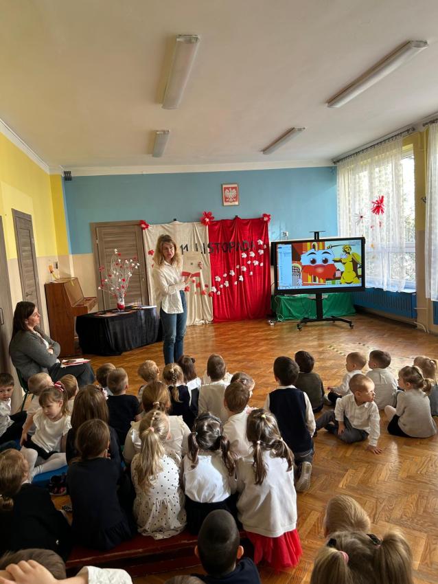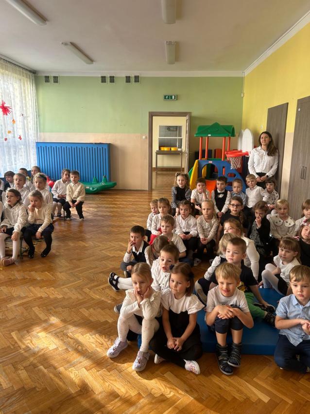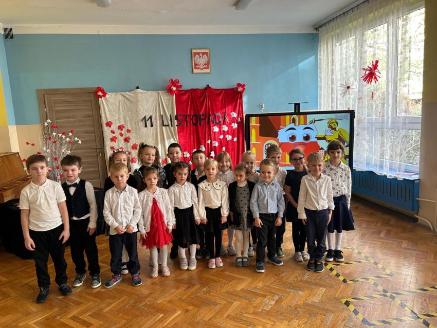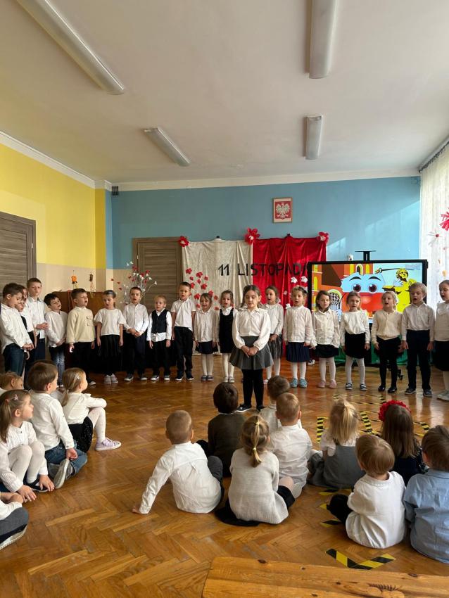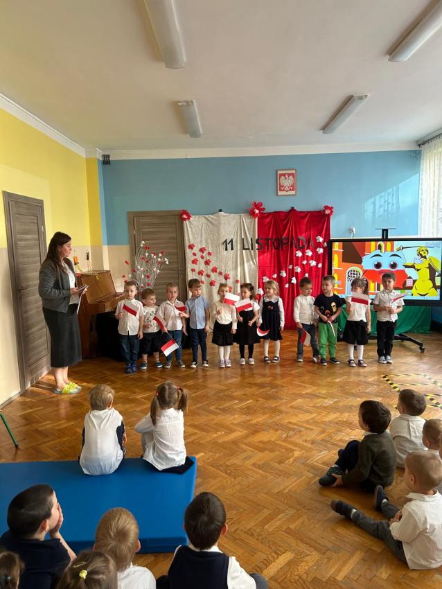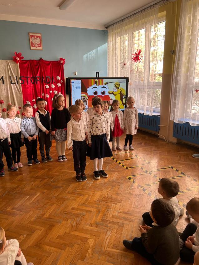 Dnia 12.11.2025r. w naszym Przedszkolu świętowaliśmy dzień w którym Polska odzyskała niepodległość. Dzieci obejrzały krótki filmik edukacyjny o dniu 11 listopada z którego dowiedziały się co to jest niepodległość i dlaczego Polacy obchodzą to święto w listopadzie. Uroczyście odśpiewaliśmy hymn, po którym nastąpiła prezentacja repertuaru poszczególnych grup, przygotowanego specjalnie na tę uroczystość.